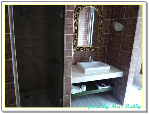 洗手台兩旁 一邊是乾溼分離的淋浴間 一邊是馬桶